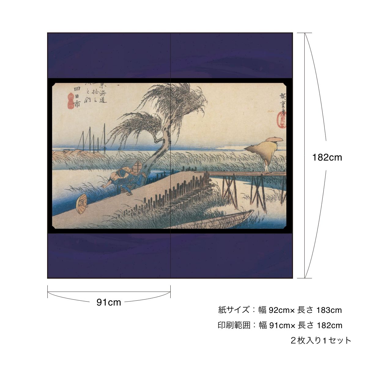 Ukiyo-e Fusuma Paper Fifty-three Stations of the Tokaido Hiroshige Utagawa Yokkaichi-juku Miekawa 2 Sheets 1 Set Water Paste Type Width 91cm x Length 182cm Fusuma Paper Asahipen JTB-044F